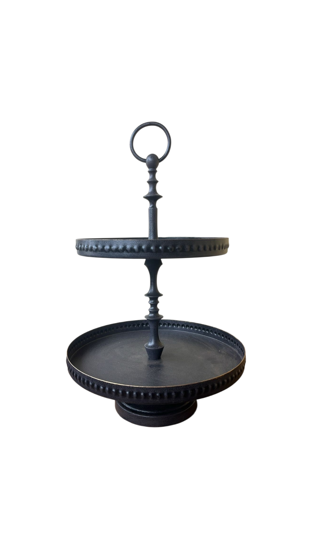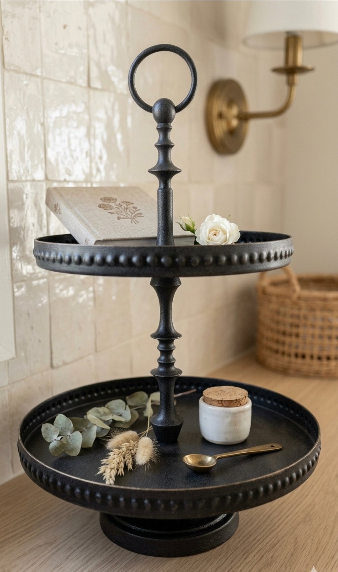 Esta bandeja de dois andares em metal se destaca pelo seu acabamento escuro sofisticado e pela delicada borda perolada (beaded edge) — um detalhe clássico de inspiração europeia, amplamente valorizado no estilo farmhouse por trazer textura, charme e um toque de elegância sutil.