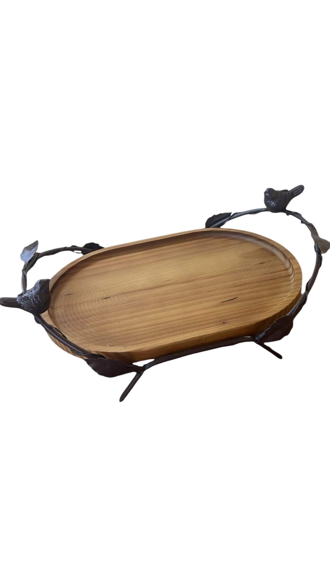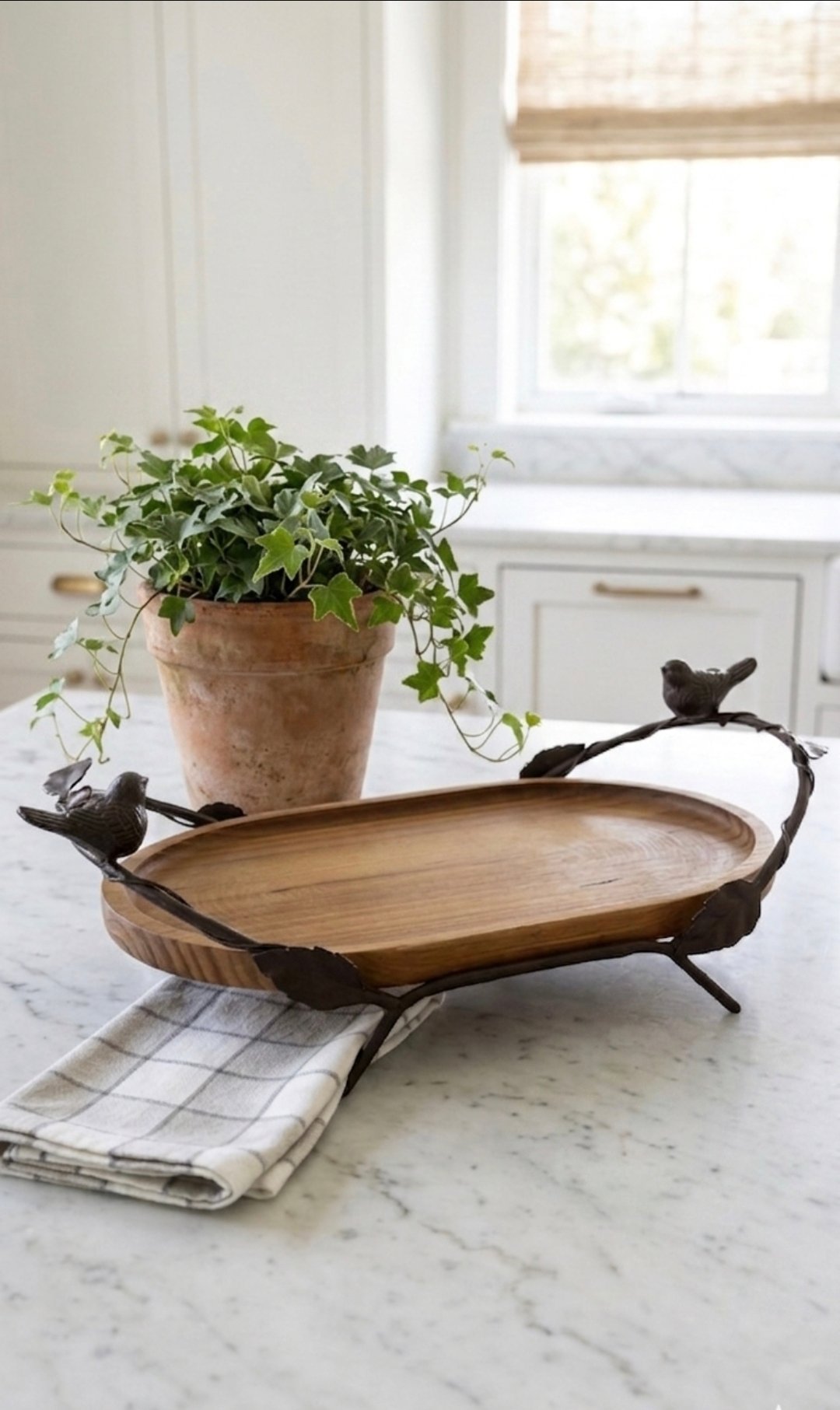 A combinação da madeira natural com o ferro delicadamente trabalhado forma uma bandeja cheia de personalidade, enquanto os pequenos pássaros trazem um toque poético que encanta à primeira vista.
